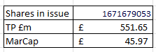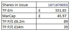 Even if it were possible (let’s be optimistic) then in that scenario you’re looking at a P/E of 39X to arrive at a £551m target price.