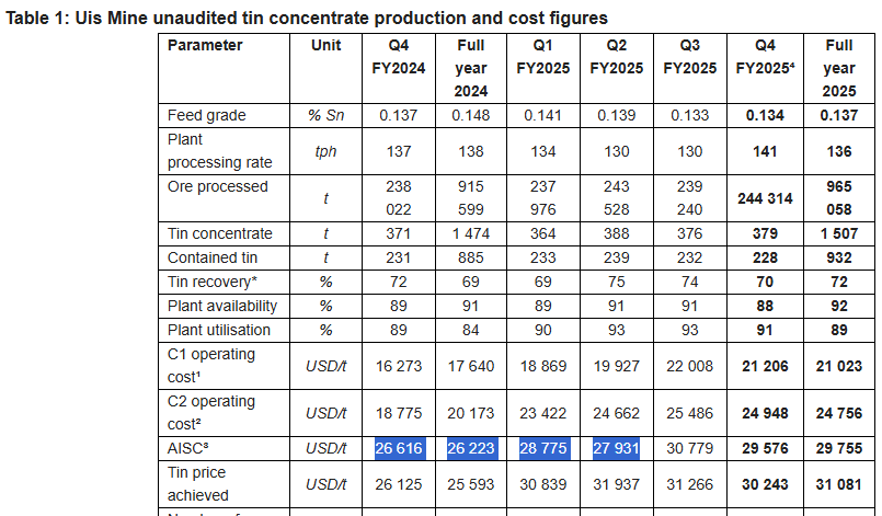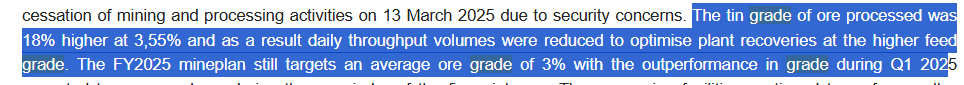 The 0.136% grade is down about 10% compared with the average of 2024’s feed grade. It’s 26X worse than Alphamin’s feed grade. Alpha *IS* worth £580m market cap today (i.e. the 11X target price of the broker). Alphamin is in the DRC so has its own problems but a low grade of tin is not one of them. Nor a high AISC either.