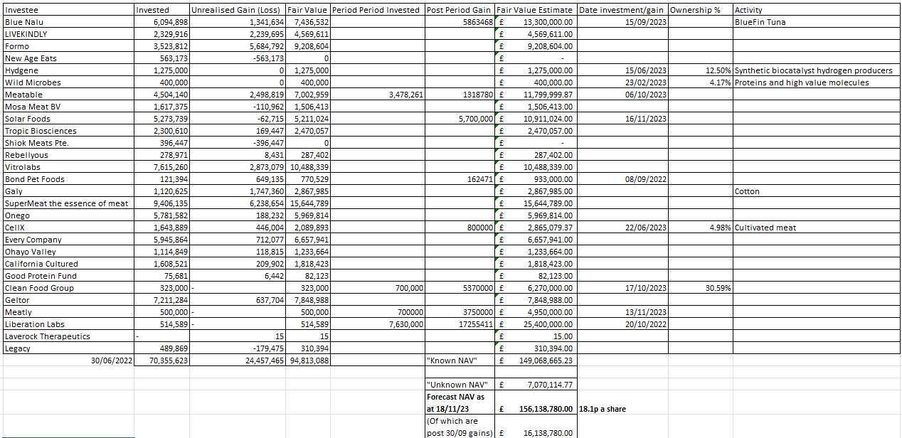 ANIC: Agronomics, Market Cap £91.8m, Bid 9.1p Ask 9.4p, Estimated NAV 18.1p, Investments £164m + Cash £24m = £180.1m (16/11/23), discount to NAV 49.2%, 993.15m shares