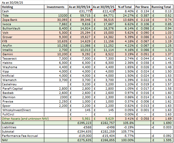 The persistent 45% discount is so severe that the book value of Cash + Tide + Zopa + Iwoca + Bullion Vault (the 4 largest holdings) exceeds the share price by 5p a share, with everything else thrown in for free.