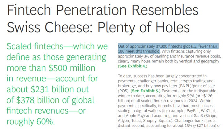 For example, this BCG report from May 2025 said of 37,000 fintechs globally, fewer than 100 generate more than $500m revenue.