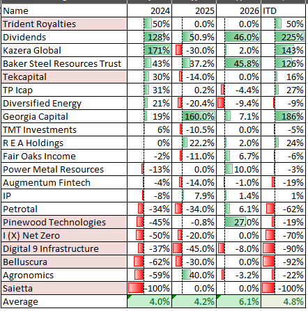 I recently covered the remaining ideas in a year end review and other than DGI9 I’m happy to keep the remaining ideas in play. The ones in pink are those where I’ve called time through choice or necessity.