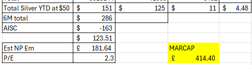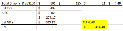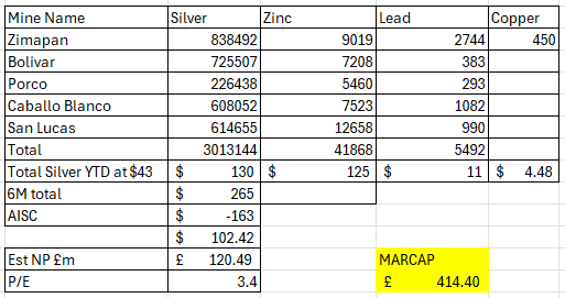 If I take the current $22.95 AISC per ounce, and deduct 25% for tax, plus take the production from 1H25 and double that to get an annualised estimate. I take today’s Silver price leaving Zinc/Lead/Copper at current prices then I arrive to a £120m net profit for the next year based on steady production with no efficiency improvement.