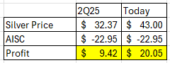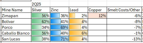 First of all that 2Q25 Silver Equivalence was based on $32.37 per ounce silver. At this evening’s $43 silver, profits are now double, while Zinc remains static to its price in 2Q25. Silver is today over 60% of the silver equivalent ounces.