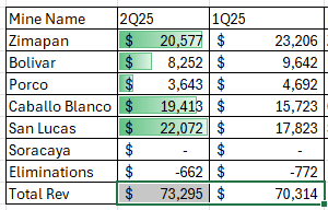SCZ is increasing its output too, up a modest 2% from 1Q25 to 2Q25. The underlying performance is stronger averaging 10% except for the Bolivar mine which suffered flooding in 2Q25. A one-off factor.