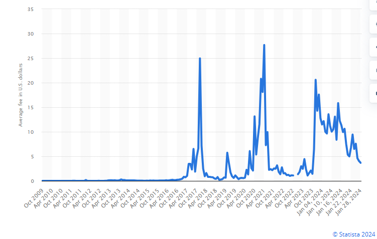 Moreover Bitcoin (and other current) cryptos do not currently play any meaningful role as a currency so it is inaccurate to call them a “currency” - at least for now. Bitcoin transactions aren’t particularly cheap either. Statista tells us $5-$25 per transaction. For that sort of cost would that be a practical form of exchange? Compared to a metal coin or a precious metal I can hold in my pocket or barter with or even the many inter-bank transactions and well established Visa/Mastercard/Amex payment on rails which usually costs me zero and the retailer 2%-3% (for the latter). Who exactly is paying $5-$25 per crypto transaction and for what? Since I think it unlikely this is for milk, eggs and a newspaper so the only conclusion I can come to is that those fees are loaded into each Crypto purchase and sale. So these fees are a burden for anyone hoping to live their life earning Bitcoin and buying their goods and services via Bitcoin. Do any such people exist? Even Tesla stopped letting you buy their products in Bitcoin or was it Doggy Coin? I forget.