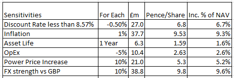 The six sensitivities to the NAV itself could be at worst neutral, but it’s likely that in 2026 power prices are tending higher, FX will be stronger vs GBP, inflation will be higher, with limited downside from higher discount rates and higher opex.