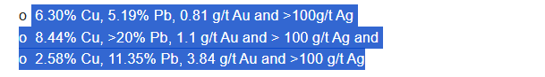 It’s very early stage and far from being a producing mine like HOC but consider this “historic report” reference. 21Kt at 31.2g/t Gold and 2067g/t Silver. Wait what?