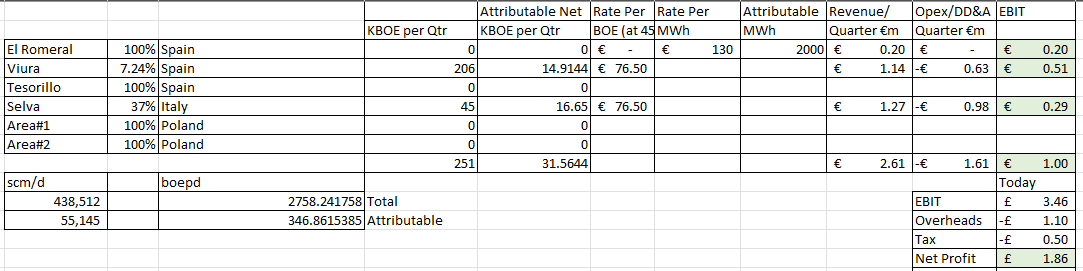 Using €130 Euros/MWH electricity prices and converting €/MWH to €/BOE prices gives us €76.50 currently gives us a 2026 £1.86m net profit (1m Euros/Quarter operating profit); and around £2.75m of cash flow in 2026.