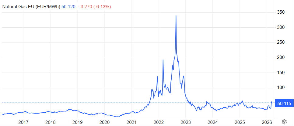 Today, TTF Natural Gas is over €50 per MWh. Let’s put that number in context to recent history. And more on that later.