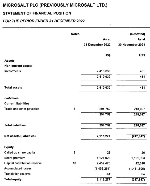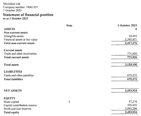 I spotted that Microsalt Ltd have given us a 9 month picture of their accounts as at 30/09/2023. They had to produce this due to the Mystery#1 share swap.