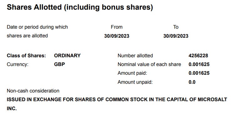 The answer is found at companies house where 7m shares were issued. Why? To increase the holding by Microsalt Ltd of Microsalt Inc. It now owns 92% of Inc (not 79% as before).