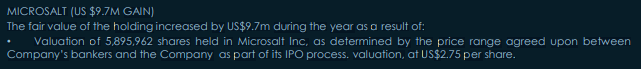 But how did TEK value Microsalt in its 2022 accounts? TEK booked a $9,742,595 fair value gain on its holding in Microsalt in 2022 (and it’s nice to see that fair value value only 100% backed up with today’s float valuation)