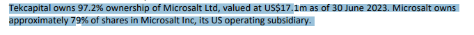 In the half year report it was reported that TEK Europe owned 97.2% of Microsalt Ltd.