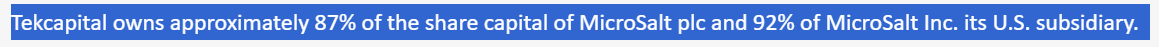 Yes. £18.5 admission price is £1.5m below the premoney estimate I reported on before but nevertheless values TEK’s holding of 77.24% at £14,289,400. In its last accounts its investment in Microsalt was valued at $17,095,379 which is £13,460,928. So a £828,471 gain for TEK. Plus £3.5m of liquidity some of which will repay LUCY but leaves just under £3m. Plus TEK maintains a strong majority holding in a listed entity.