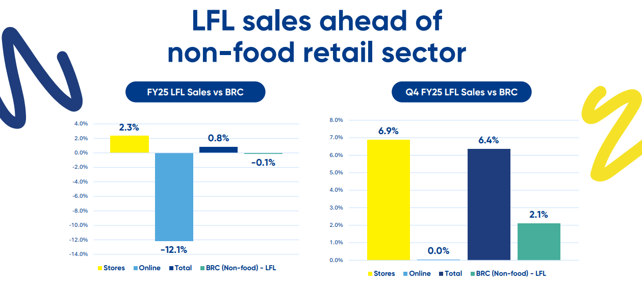 The point is, while modest, the op profit has quadrupled between FY23 to FY25. Relying on a “yearly percentage growth” number as to the success of online masks that simple yet profound fact. You’d reduce profits by around 20% by shutting down online. With a new fulfilment provider reducing costs, a new click and collect proposition and a more realistic free delivery order level, I think ecommerce might be a surprise in FY26 and beyond. I road tested the new web site and it is clear, crisp, and uncluttered. It has that “honest to goodness” feel about it so seems to pitch right for its target audience of busy parents catering for their kids.