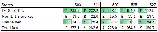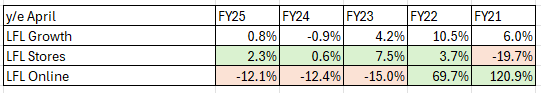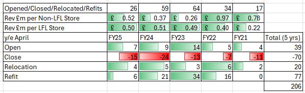 The picture that emerges is stores in FY25 are selling about 25% more per store than they did back in 2021. 2020 was a lockdown year so I’m just ignoring that. Obviously the “non-LFL” stores rev per store is much higher in 2020 and 2021 back when closures were low relative to openings, relocations and refits. The “non-LFL” stores in FY23 - FY25 are much much lower reflecting the larger number of closures.