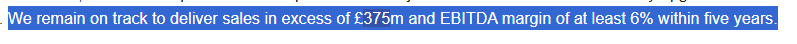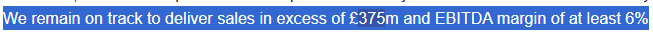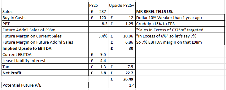 Will the back of the fag packet calculations all happen in FY26? I’m now assuming not (yet). But it doesn’t matter. £290m instead of £375m of sales, no -£12m reduction in cost of sales, no increase of margin to above 7% are in the above assumption of a jump in profit.