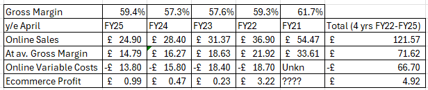 While, yes, profits peaked in FY22 that was due to lockdown and people wanting to get stuff. But remember my point about ~£6m of underlying profit that was “delayed” catch up sales due to lockdown. The true online profit in FY22 is probably lower.