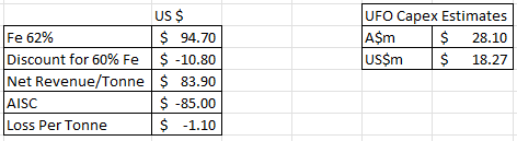 So the obvious question here is why are UFO progressing an uneconomic asset? Do they expect costs to fall, and if so how? Do they expect (hope for) prices to recover? Could they be planning to ship 62% Iron Ore (which would remove the discount) in stead of 60%?