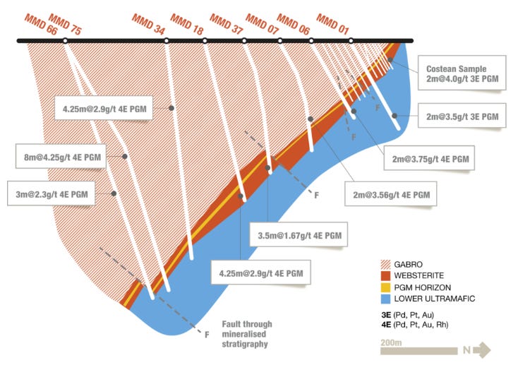 Based on several drill holes (see below), a non-JORC resource of 24Mt resource for MunniMunni grading 2.9g/t PGM’s - containing palladium 1.14Moz, platinum 0.83Moz, rhodium 75koz, and gold 152koz – is reported for Munni-Munni.