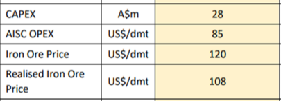 UFO’s study dates back to Feb 2024 and reveals “excellent returns”. Excellent is defined as a NPV10 DCF of US$93m over an 8-year mine life, producing 1.25Mt 60% iron ore per year of DSO on a mining inventory of only 8.4Mt and with an initial capex set at only A$28m (US$18.2m), based on an iron ore price of US$120/t.