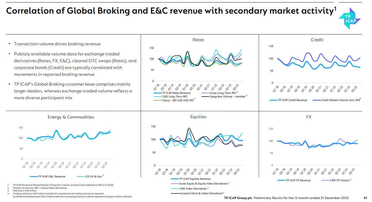 While half of revenue and contribution is via global broking which covers interest rate products so options, swaps and futures for bonds, treasuries, repo, municipals. Revenue is driven by activity. This chart illustrates the correlation.