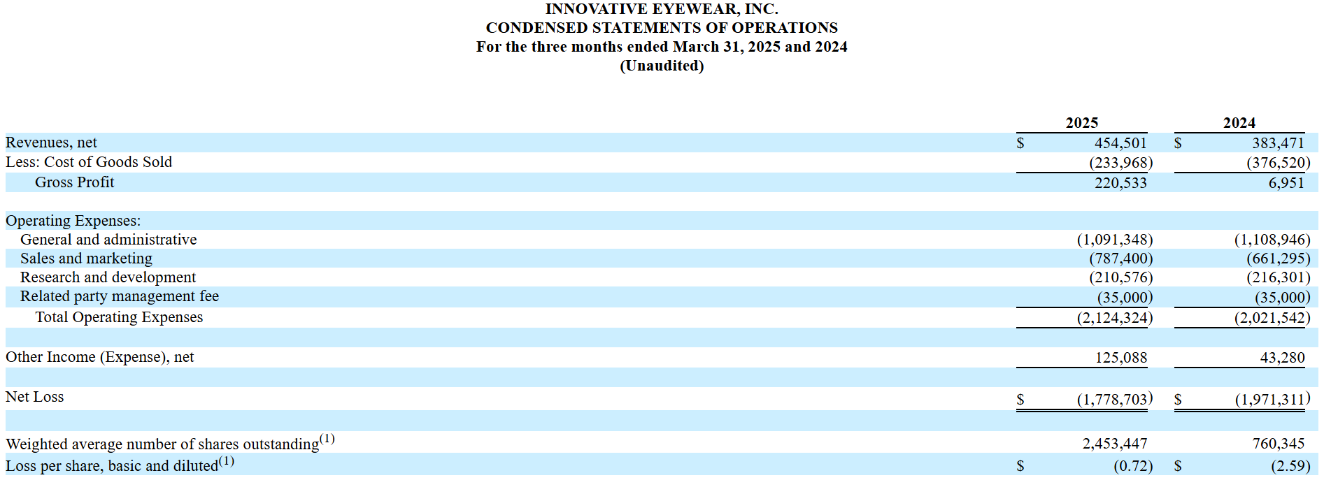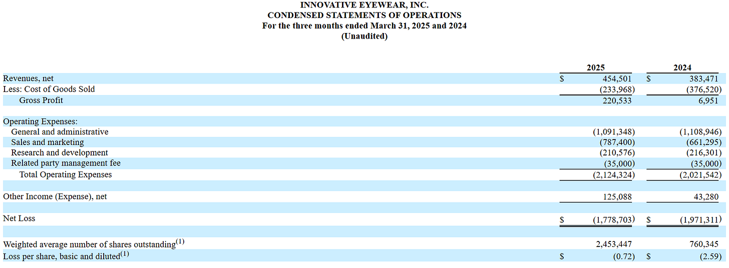 LUCY - no traction in sales, the glasses are great the financials have disappointed. Can it turn around with Reebok, Armor, Eddie Bauer brands added? Not enough sign of it. Where are the sales? $70k or 25% more in 1Q25 c.f. with 1Q24? It’s just not enough.