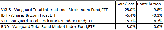 Instead of paying for a subscription Mr Arby drank beer and did not wake once at 7am to read an RNS. He put 35% on VXUS, 40% on VTI, 20% on BND and 5% on IBIT. Interestingly, if he’d chosen 50/50 VXUS/VTI his gains would be over 20% and Mr Thompson would be fourth place. Personally I’ve witnessed year after year of poor returns via Bonds but it is the idea of balance that we should keep a 60/40 portfolio. Perhaps BND will deliver one year and I will see the point of it. IBIT cost Mr Arby but not too much. A 5% weighting meant a -0.3% detraction.