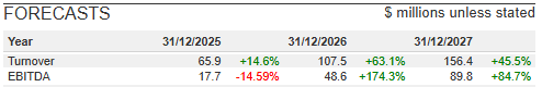 Beware of forecasts. The broker guess made me chuckle. All sunny uplands ahead for TXP apparently. It achieved $3m EBITDA in 3Q25 so to forecast $89.8m in 2027 would be a 700% performance improvement. Is that even remotely possible? Give me a break.