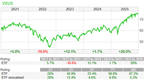 VXUS non-US stockmarkets has consistently delivered year after year.