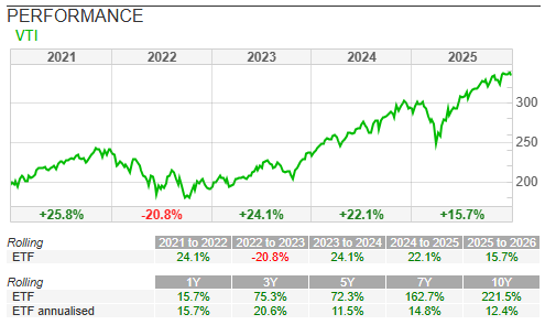 The VTI contains a big chunk of Mag 7 although the UnMag 493 feature too along with other US stocks. It’s also consistently delivered and +221.5% over 10 years so 12.4% per year on average. Those are great numbers, and you have to be brave to stay out of the US stock market.