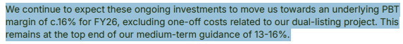 So the 3Q26 news that the full year would be close to 16% excluding one-off costs is encouraging to see.