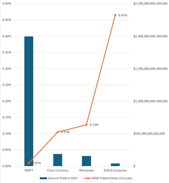 It’s only when you put these numbers in a chart that you perhaps realise the scale of the opportunity for WISE. It has a 0.47% market share in B2B cross-currency payments. But only a 0.01% market share in the growing SWIFT payments market.