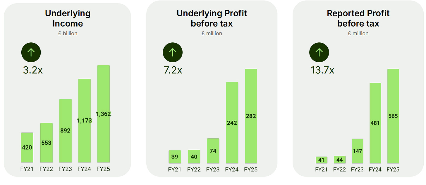 The 1H26 result (to September 2025) delivered a 16.3% underlying PBT margin. £122m underlying PBT vs £749.5m income.