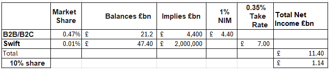 With a 10% share of the market WISE would earn well in excess of £1bn net profit per year. That further assumes (as they do) that 1% NIM is the extent of the earnings capability of holding customer balances. Currently that NIM is closer to 3%.