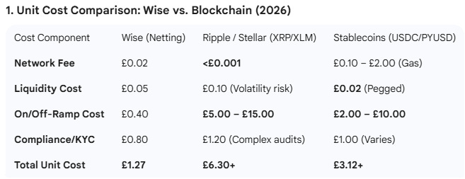 Other Fintechs cannot touch Wise either. While Blockchain “could” be cheaper in reality hidden costs mean it isn’t on a like-for-like basis. 3X more expensive at £3.12 per £1000 moved is the most optimistic cost and the true cost could be 13X more expensive (unluckily for them)